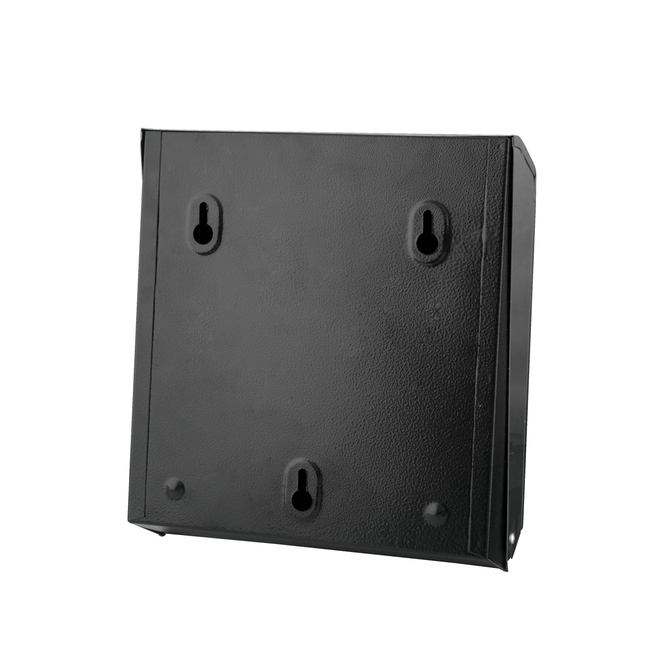 Gabinete frontal e base de fixação em chapa de aço, espessura 0,6mm, acabamento fosfatizado, tinta epóxi, possui mecanismo/trava do gabinete, que garante abertura apenas com a chave.