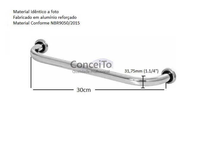 Barra de apoio para banheiro 30 Cm reta em alumínio, por ser fabricada em material de alumínio a barra é resistente à ação do vapor da água quente, evitando o surgimento de ferrugem, todas as barras de apoio acompanham parafusos de inox e buchas para instalação. O produto acompanha canopla reta de inox 304 para evitar bactérias no parafuso. Desenvolvida para dar segurança para pessoas com deficiências, idosos ou que necessitam de apoio no banheiro.