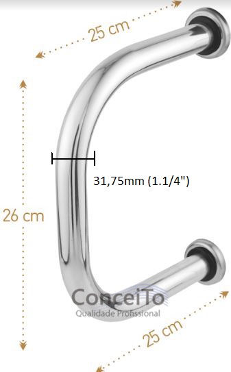 Barra de apoio lateral para lavatório, fabricada em alumínio polida, desenvolvida para instalar ao lado do lavatório, conforme a NBR9050-2015 para dar mais segurança e auxiliar pessoas com deficiência ou que necessitam da barra de apoio no banheiro. Fabricada em base de latão reforçada e canopla de inox 304 com anel oring, para esconder o parafuso, evitando acúmulo de bactérias no parafuso.