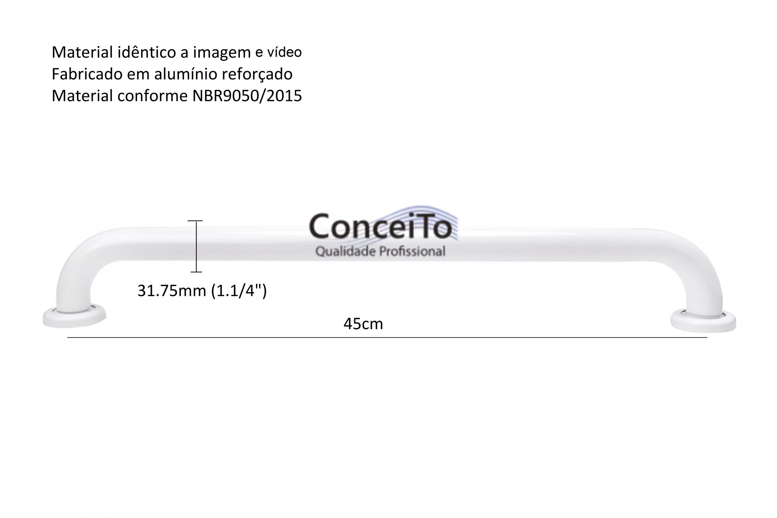 Barra de apoio reta 45 cm para banheiro PNE, fabricada em material de alumínio desenvolvida para dar segurança para pessoas com deficiências, idosos ou que necessitam de apoio no banheiro, barra de apoio conforme a norma NBR9050, já acompanha parafuso e bucha.