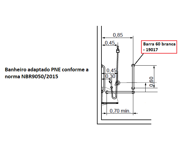Barra de apoio reta 60 cm para banheiro PNE. Fabricada em material de alumínio desenvolvida para dar segurança para pessoas com deficiências, idosos ou que necessitam de apoio no banheiro, barra de apoio conforme a norma NBR 9050. Já acompanha parafuso e bucha.