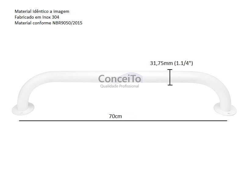 Barra de apoio para banheiro 70 Cm reta em inox 304. Por ser fabricada em material de aço inox 304 com medida do tubo 31.75cm espessura 1.5mm, comprimento 70cm. Conforme a norma NBR9050, a barra é indicada para banheiro PNE, para banheiro de idoso e ambiente público. Desenvolvida para dar segurança e auxiliar pessoas com deficiência, idosas ou que necessitam de apoio no banheiro. Pintura epóxi eletrostática.