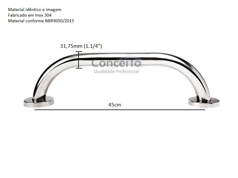 Barra de apoio para banheiro 45 Cm reta em inox 304. Por ser fabricada em material de aço inox 304, a barra é resistente à ação do vapor da água quente, evitando o surgimento de ferrugem. Todas as barras de apoio acompanham parafusos de inox e buchas para instalação. O produto acompanha ainda canopla de inox 304 conforme a norma NBR9050 para um acabamento perfeito.