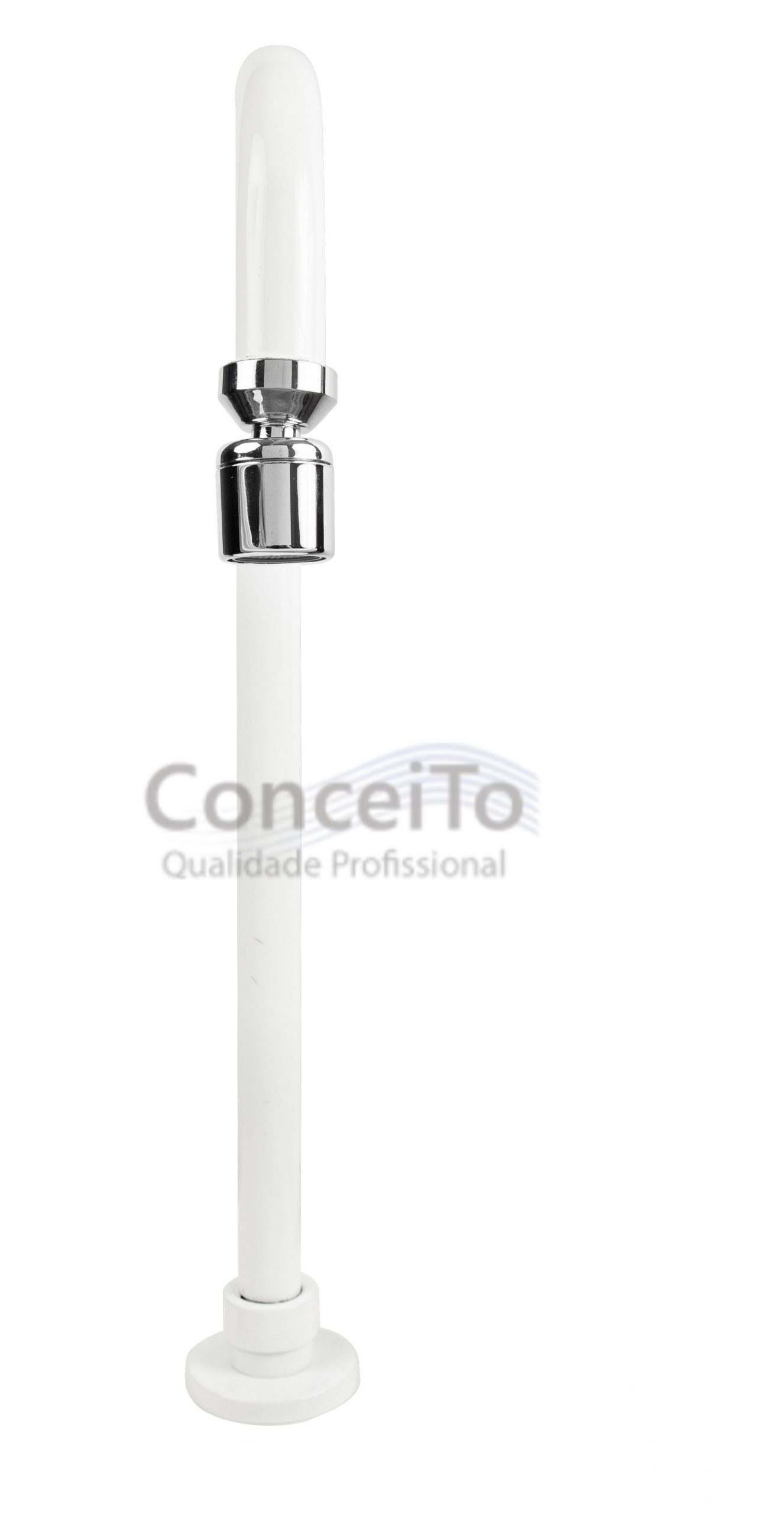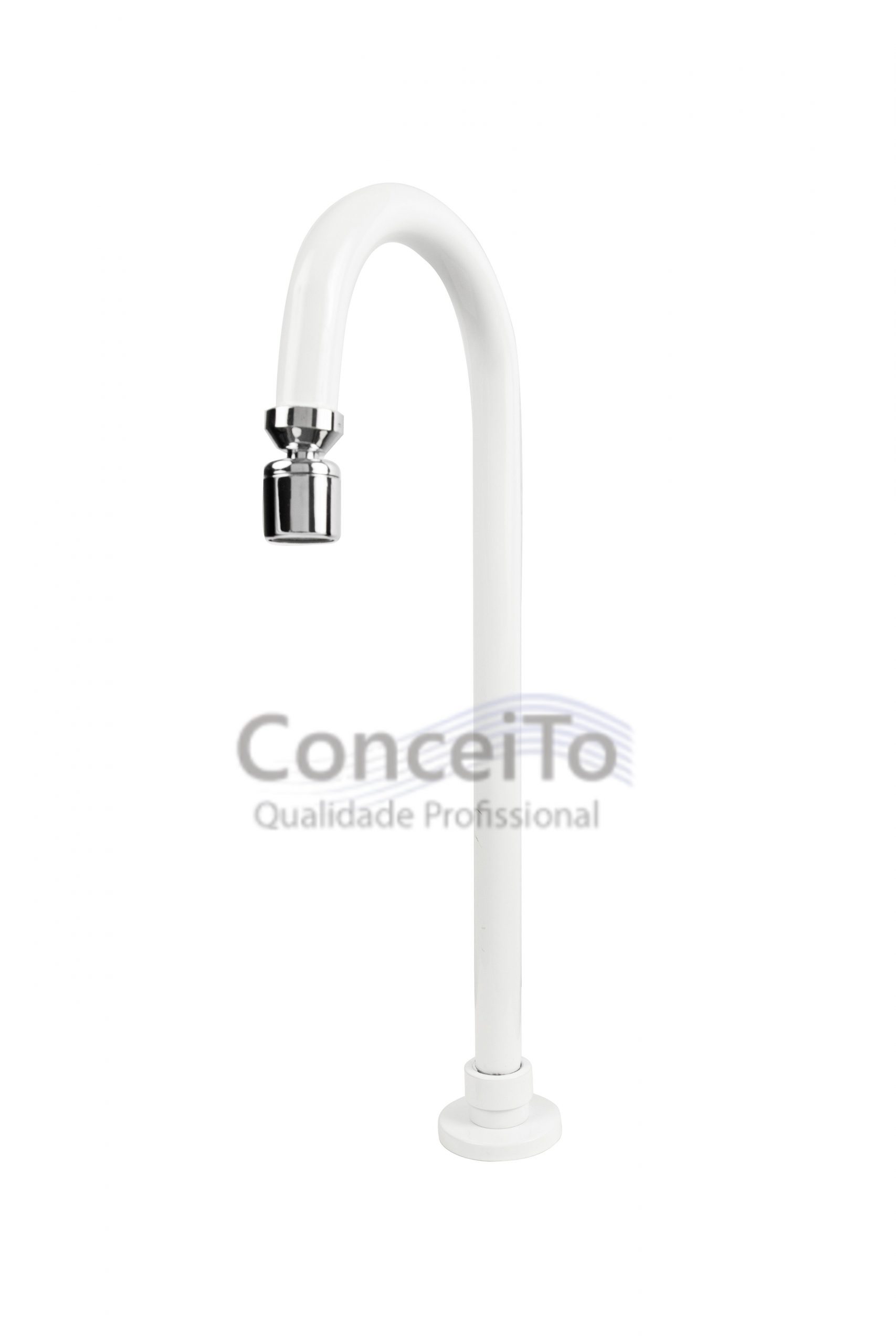 Torneira de metal com bica móvel branca de mesa para acionador com pedal. Ela não possui registro evitando o contato manual. Ideal para acionadores de pedal para uso em hospitais, clínicas, laboratórios e restaurantes. Fabricada em metal cromado e possui bico arejador.