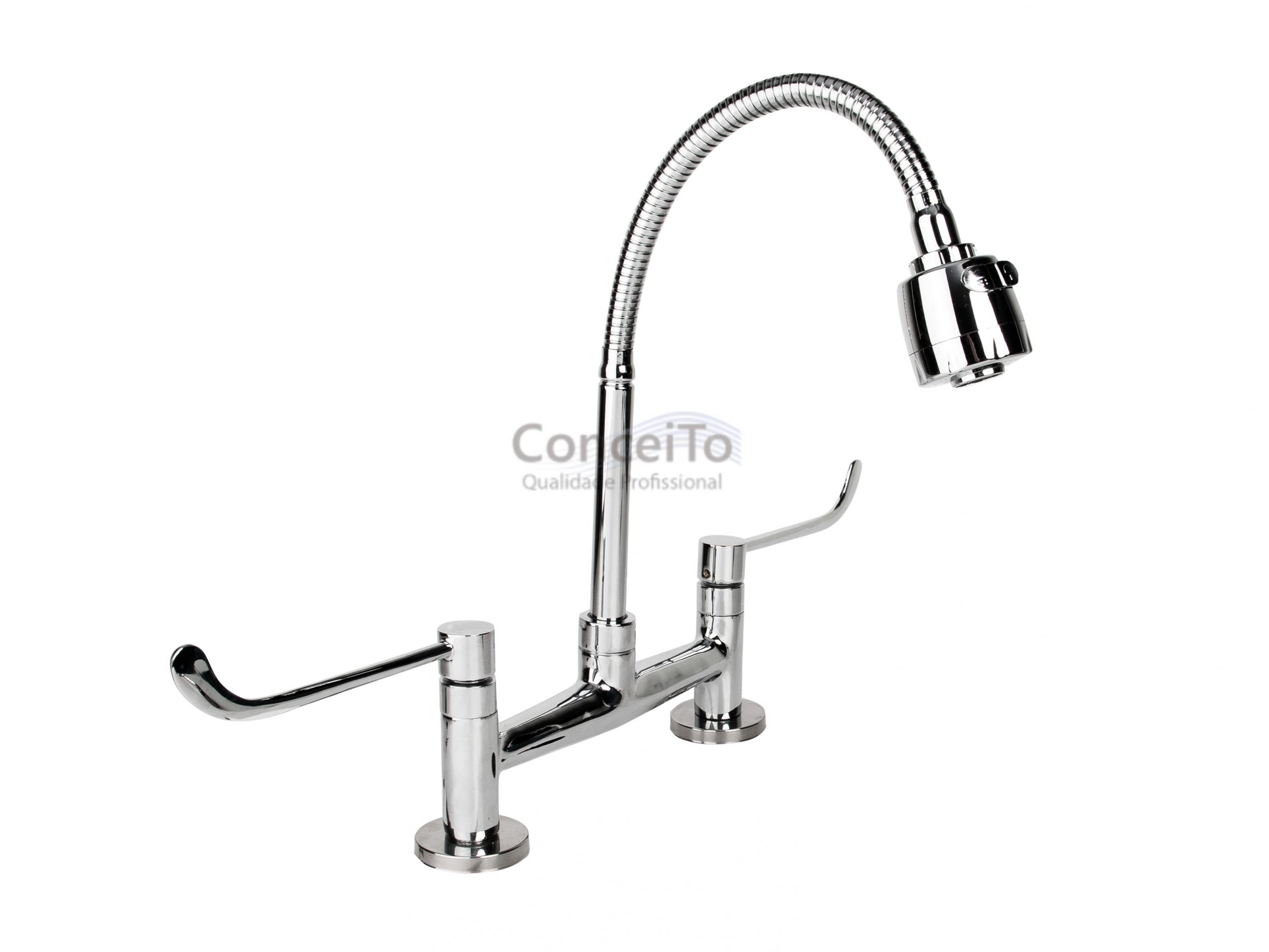 Misturador torneira clínica de mesa com fechamento através do cotovelo, com arejador de dupla função, com a opção de jato e spray. Ideal para uso médico hospitalar pois evita o contato manual e a contaminação cruzada.