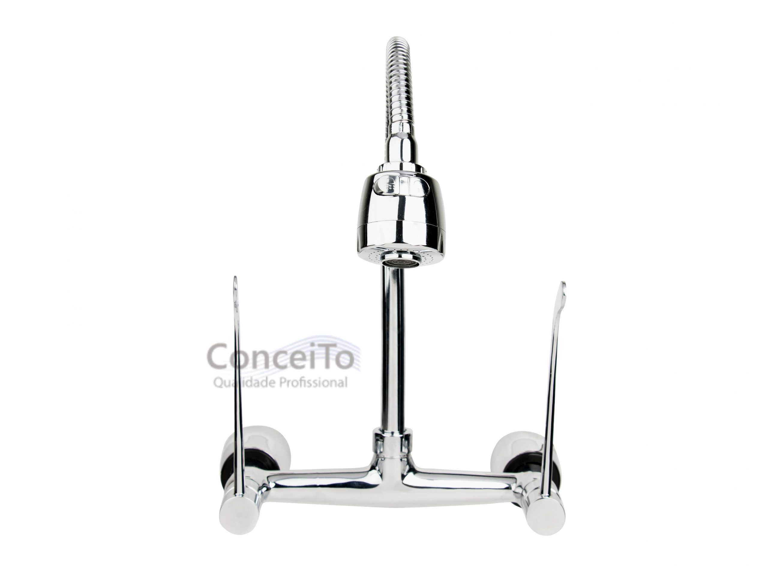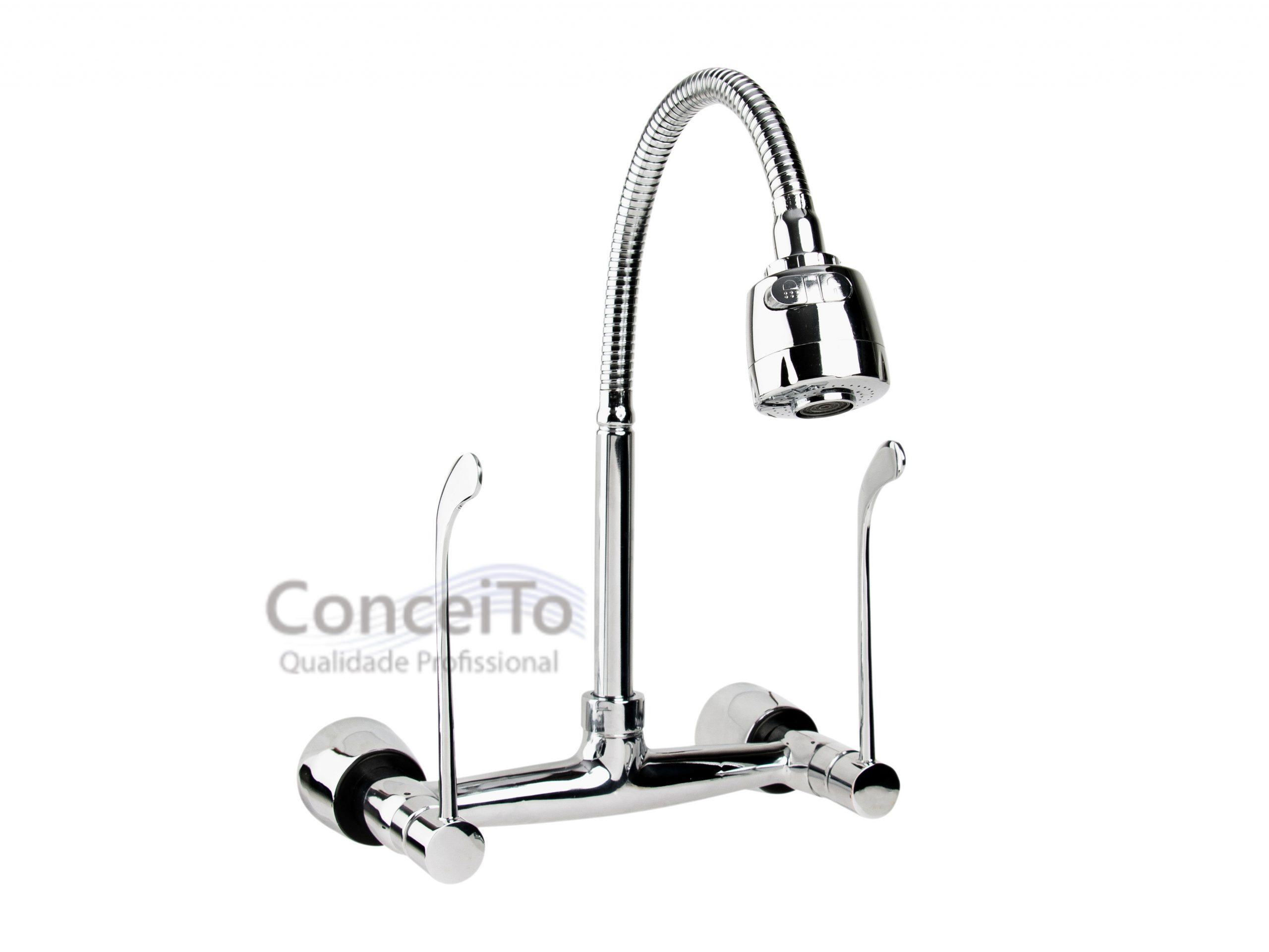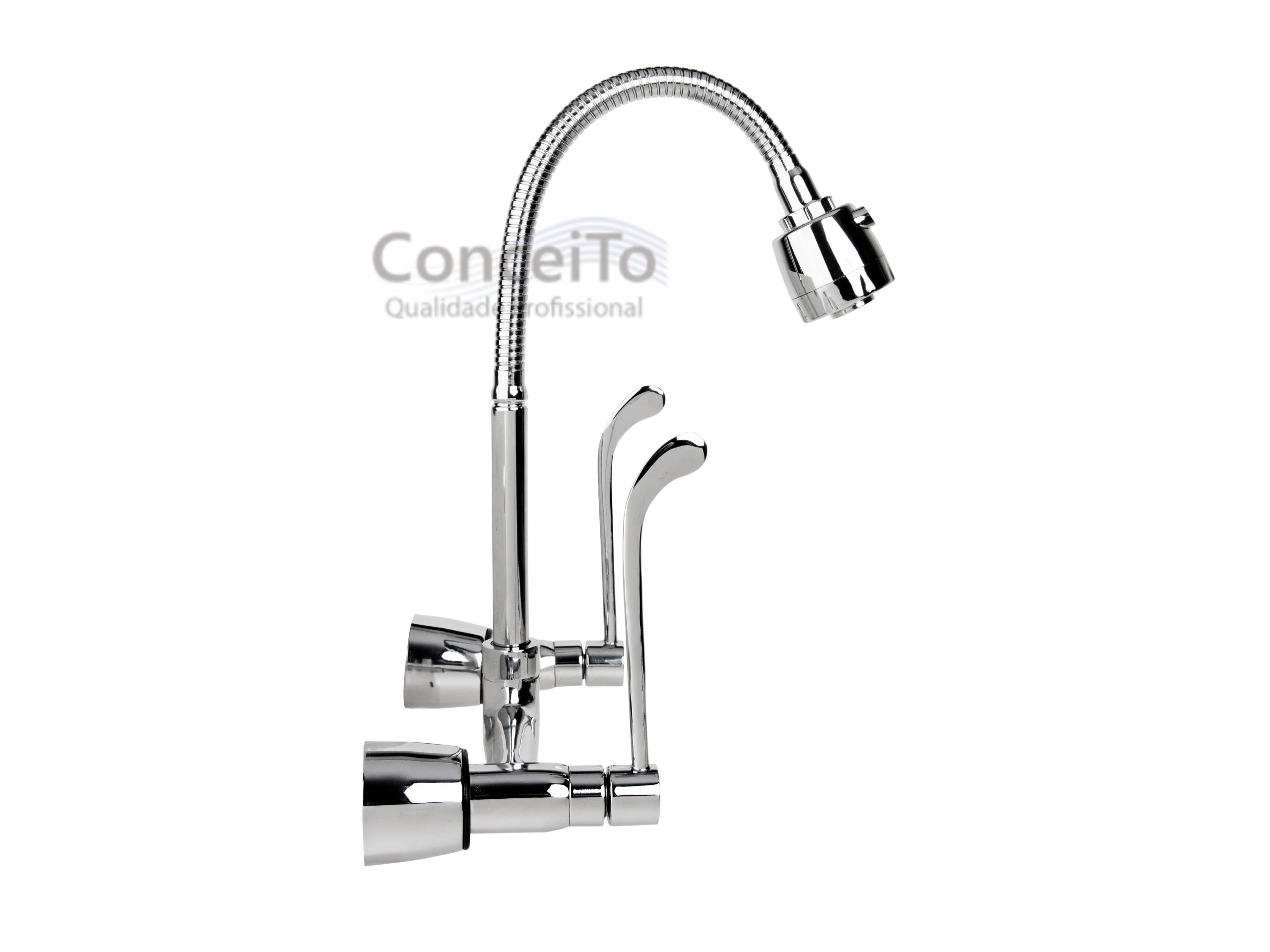 Misturador torneira clínica de parede com fechamento através do cotovelo, com arejador de dupla função, com a opção de jato e spray. Ideal para uso médico hospitalar pois evita o contato manual e a contaminação cruzada.