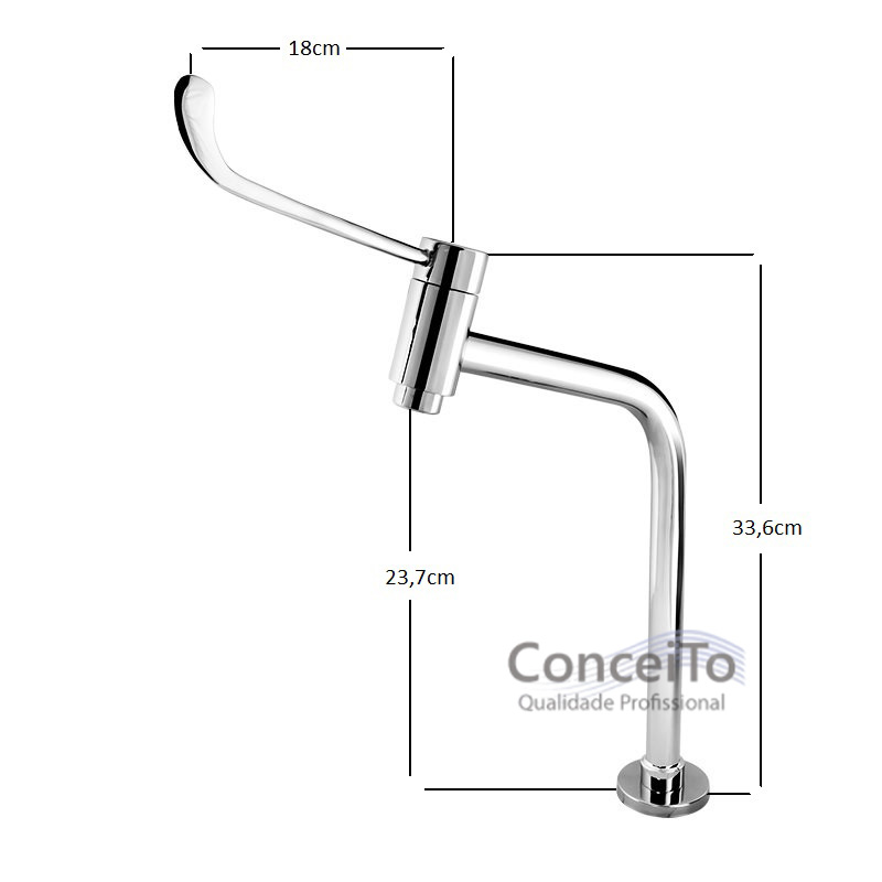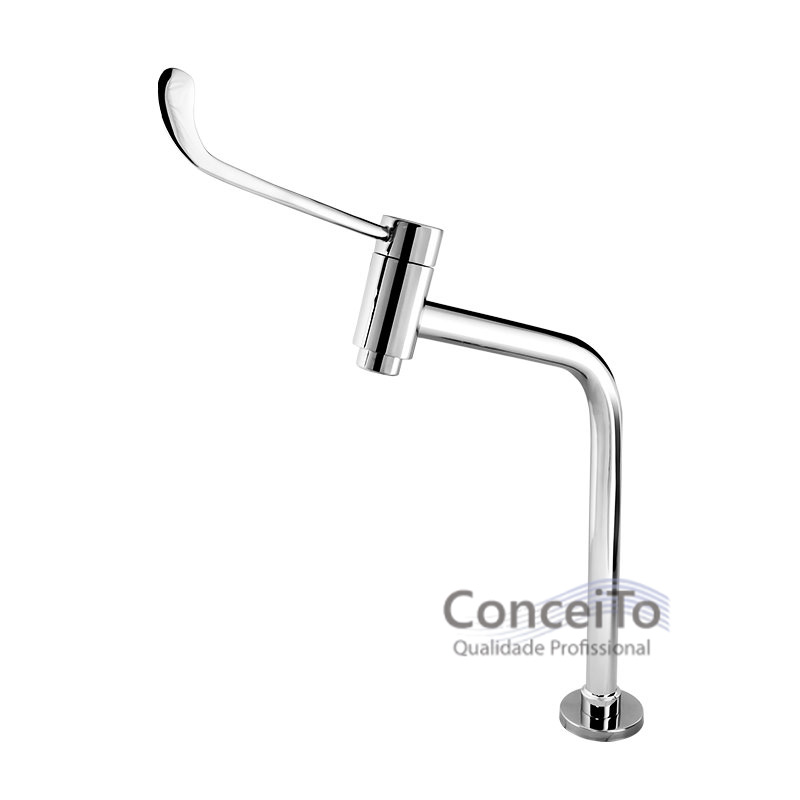 Modelo desenvolvido em metal cromado. De acordo com a norma NBR9050. Altura do arejador até a base de 23,7 cm. Maior conforto ao usuário, facilidade no acionamento. Compátivel com cubas de embutir, cubas de apoio ou sobrepor.