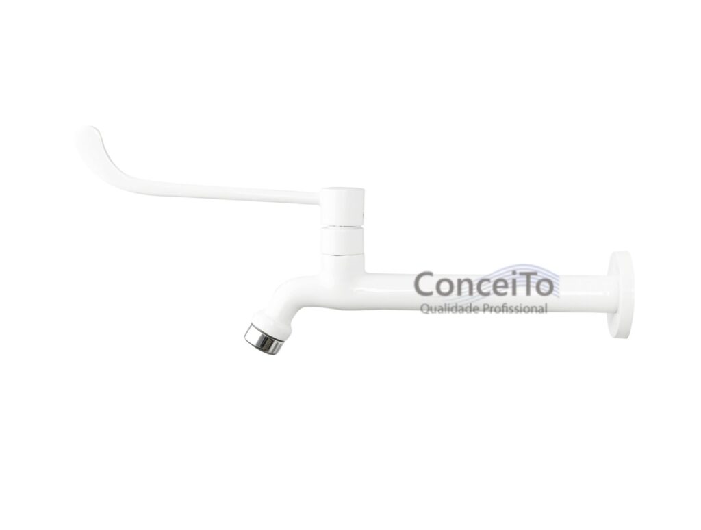 Torneira clínica 90º (Graus) com abertura e fechamento através do cotovelo, assim facilitando o acionamento, máxima praticidade e higiene, com medida de 23,7 cm.