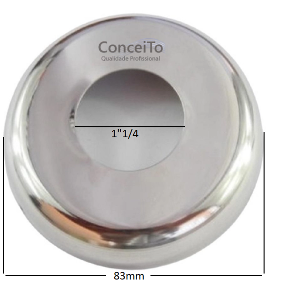 Canopla aboleada de inox 304 polida. Medida externa 83 mm, medida interna 1” 1/4, altura 10mm.