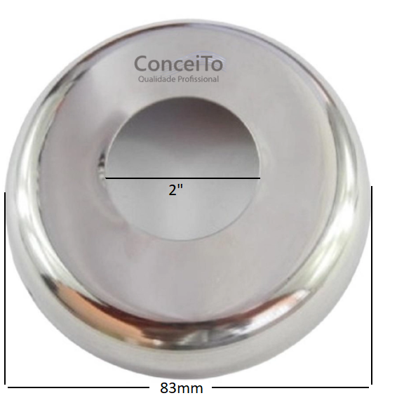 Canopla Aboleada inox polido 2”. Medida externa 83 mm, medida interna 2”, altura 10mm.