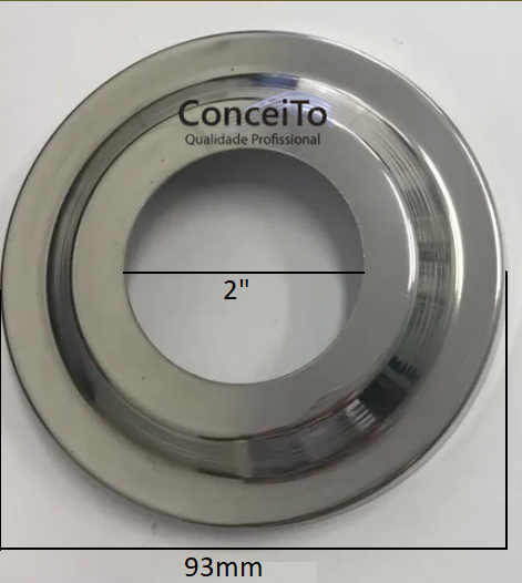 Canopla colonial inox polida 2”. Medida externa 93 mm, medida interna 2”, altura 10 mm.