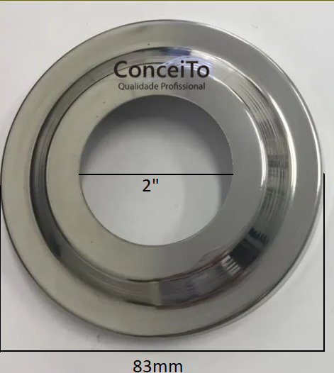 Canopla colonial inox polida de 2”. Medida externa 83 mm, medida interna 2”, altura 10mm.