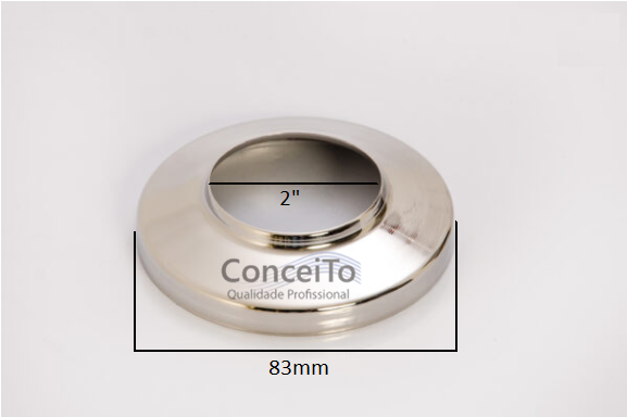 Canopla com pescoço inox 304 polido. Medida interna 2”, medida externa 83 mm, altura 10mm. Fabricamos na cor preto fosco e branco.