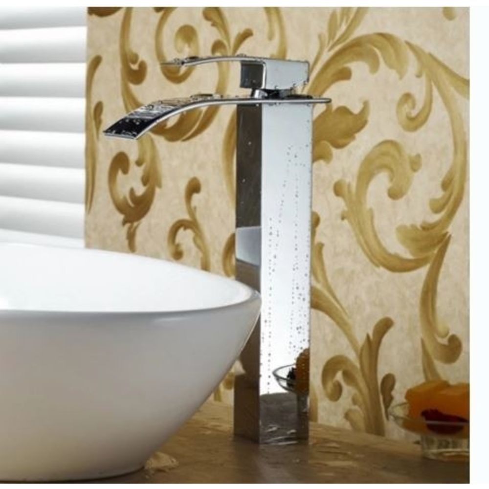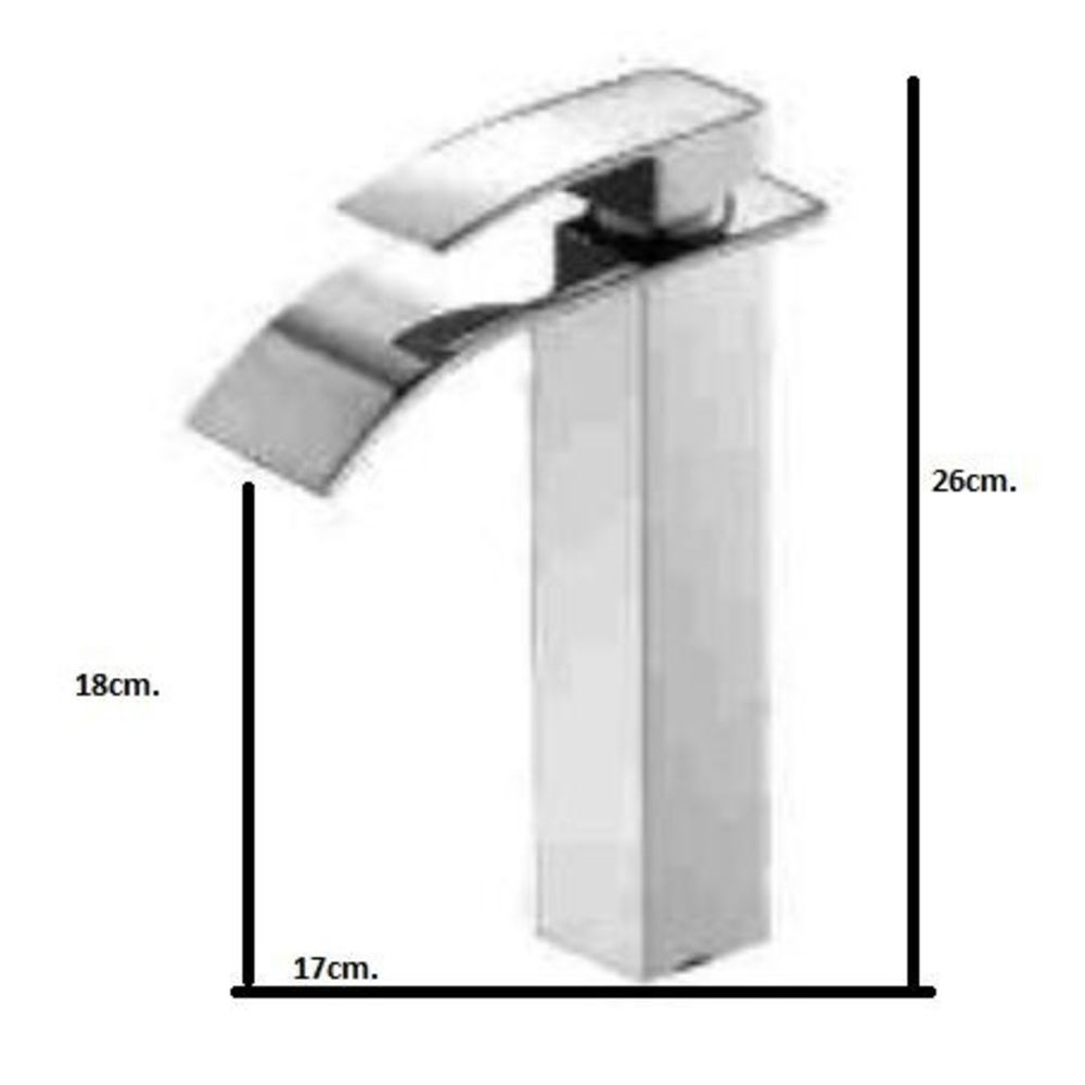Misturador monocomando estilo cascata para lavatório de mesa.