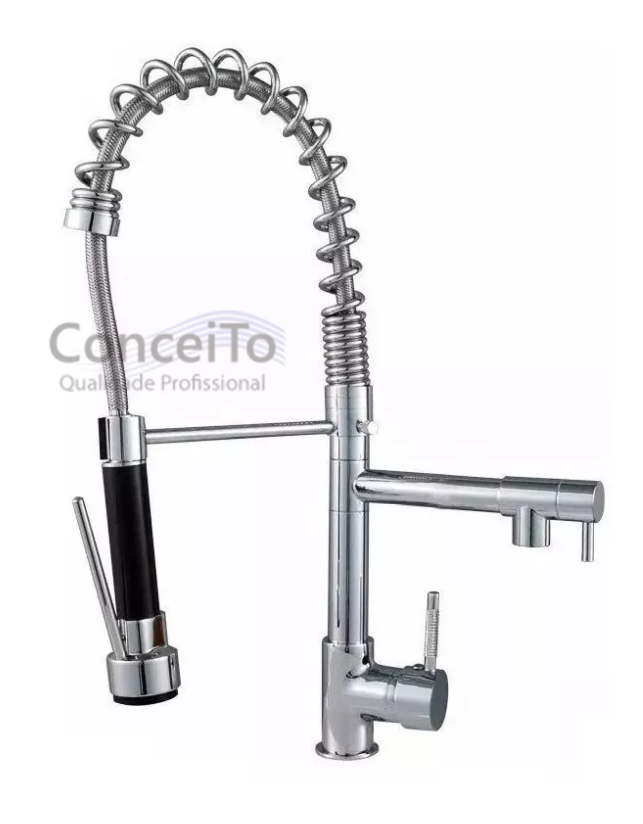 Torneira pré lavagem uso residencial, design alto luxo com qualidade superior. Cromado e mola em aço inoxidável. Antioxidante e anticorrosivo; sistema de mecanismo e cartucho cerâmico, com uma durabilidade maior do que outros modelos do mercado; ducha spray com extensor flexível para facilitar na hora de lavar a louça; bica móvel de metal, misturador monocomando.